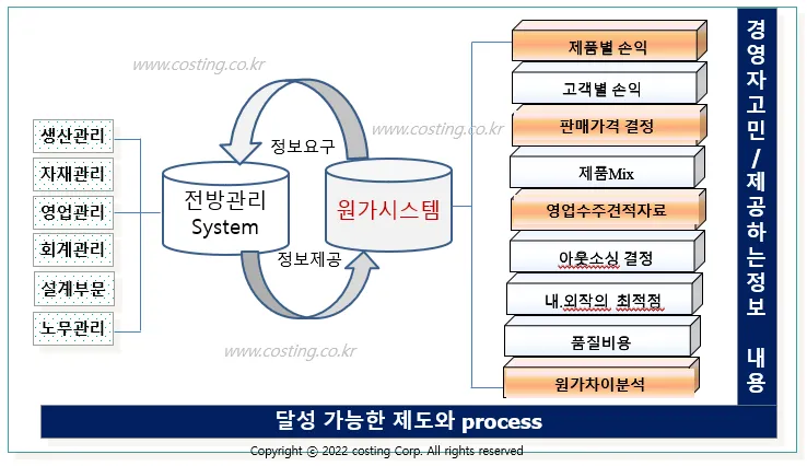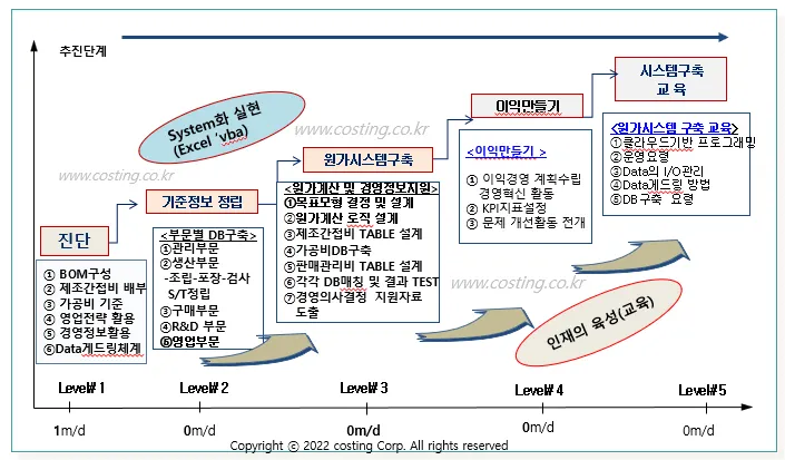 시스템 구축을 위해서는 원가 업무표준화 및 관리 시스템 구축 , 기업 경영에 맞춘 단계를 역량강화 프로그램 만들어야 합니다